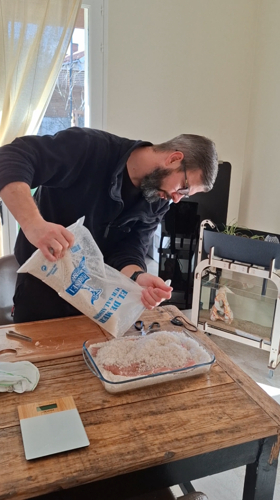 Choix du sel : Optez pour un gros sel de mer de qualité alimentaire. Déposez une couche de sel au fond d’un plat, puis placez les filets côté chair vers le haut. Recouvrez généreusement de sel.
